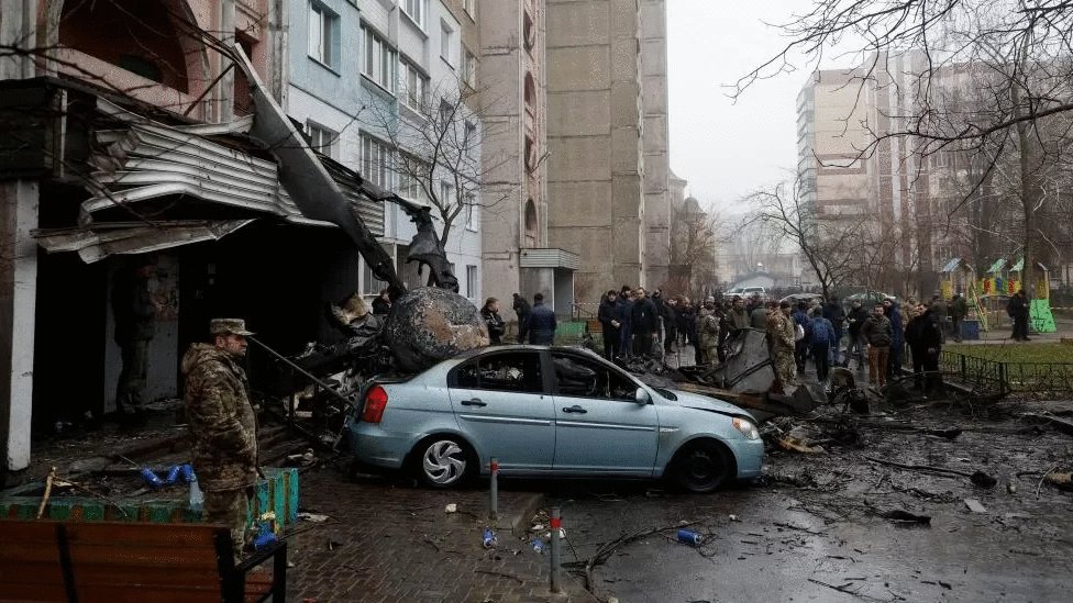 राजधानी किएभको बाहिरी भेगस्थित शिशु पाठशाला नजिक बुधबार भएको हेलिकप्टर दुर्घटनमा परी युक्रेनका गृहमन्त्रीसहित १८ जनाको मृत्यु भएको छ । दुर्घटनामा दुई जना बालबालिका पनि मारिएका अधिकारीहरूले बताएका छन् । अनलाइनमा पोष्ट गरिएको एउटा भिडियोमा आगो लागेको देखिन्छ भने रुवाबासी भएको आवाज सुनिन्छ । दुर्घटनाका सम्बन्धमा तत्काल थप विवरण प्राप्त भएको छैन । बीबीसीका अनुसार दुर्घटनामा गृहमन्त्रीसहित १८ जनाको मृत्यु भएको छ । दुर्घटनामा गृहमन्त्रालयका कैयौँ उच्च अधिकारी, गृहमन्त्री डेनिस मोनास्ट्रास्के र उहाँका उपमन्त्रीको ज्यान गएको छ ।