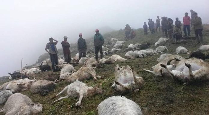 म्याग्दीको अन्नपूर्ण गाउँपालिका–३ फुर्केरुख खर्कमा चट्याङ लागेर ४५ भेडा मरेका छन् । अन्नपूर्ण–३ ठाडाका छकबहादुर पुनको गोठमा चट्याङ पर्दा ४५ भेडा मरेका हुन । आज बिहान १ बजेतिर परेको चट्याङले लागेर ४५ भेडा मरेको अन्नपूर्ण गाउँपालिकाको पशु सेवा शाखाका प्राविधिक प्रकाश जिसीले जानकारी दिनुभएको छ । ११ लाख रुपैयाँभन्दा बढीको क्षति भएको प्रारम्भिक अनुमान गरिएको छ ।