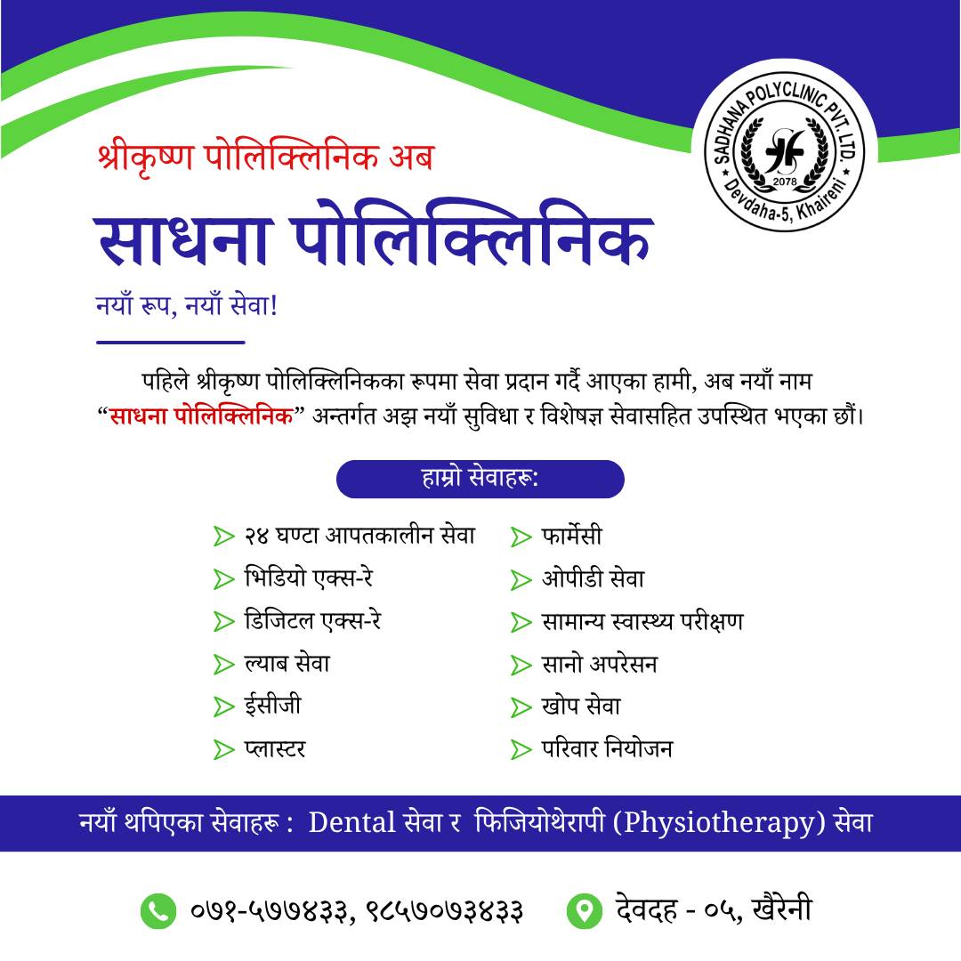 देवदह — देवदहको खैरेनीमा करिब तीन करोड रुपैयाँको लगानीमा स्थापना गरिएको साधना पोलिक्लिनिक औपचारिक रूपमा सञ्चालनमा आएको छ। पुरानो श्रीकृष्ण पोलिक्लिनिक रहेको स्थानमै नयाँ नाम र व्यवस्थापनसहित सुरु गरिएको यस स्वास्थ्य केन्द्रले स्थानीय तहमै चौबिसै घण्टा गुणस्तरीय स्वास्थ्य सेवा उपलब्ध गराउने लक्ष्य लिएको छ।
