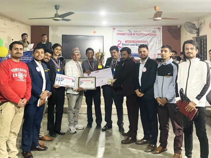 रोट्र्याक्ट क्लब अफ तिलोत्तमा–देवदहको आयोजनामा निशा मेमोरियल दोस्रो जिल्ला स्तरीय रोट्र्याक्ट क्विज–२०८२ प्रतियोगिता सम्पन्न भएको छ। प्रतियोगितामा कुल २३ विद्यालयले सहभागिता जनाएका थिए। कडा प्रतिस्पर्धाबीच न्यु होराइजन ई.बो. स्कुल ग्रुप B प्रथम बन्न सफल भएको कार्यक्रम संयोजक प्रविन गौडेलले जानकारी दिएका छन्। सोही अनुसार सेवेन स्टार ई.बो. स्कुल दोस्रो र न्यु होराइजन ई.बो. स्कुल ग्रुप A तेस्रो स्थान हासिल गरेका छन्।