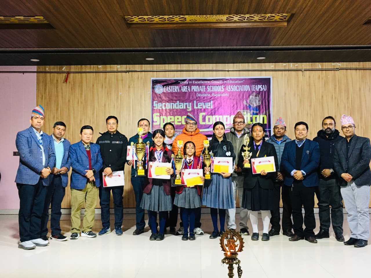 माध्यमिक तहको वक्तित्वकला प्रतियोगितामा बुद्ध पब्लिक आवासीय मा.विको आनुष्का भण्डारी प्रथम, सगरमाथा आवासीय मा.विको आरध्या पौडेल द्वितीय, मदरल्याण्ड एकेडेमीको प्रभा कार्की तृतीय र न्यू लुम्बिनी ई.बो.स्कुलको खुशी घर्ती सान्त्वना स्थान प्राप्त गर्न सफल भएका छन्। प्रतियोगितामा विजेता विद्यार्थीहरुलाई क्रमशः नगद रु ५ हजार, ४ हजार, ३ हजार र २ हजार सहित शिल्ड र प्रमाणपत्रले पुरस्कृत गरिएको थियो।